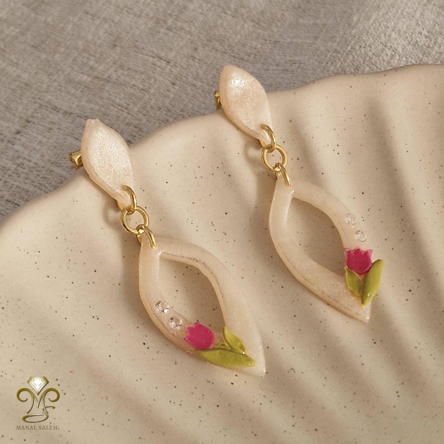 Elevate your look with the Tulip Charm - a pair of artisan-crafted drops that blend delicate florals with sparkling brilliance. Each earring features a hand-sculpted polymer-clay tulip bud in soft blush, suspended from a petal-shaped stud and accented by four shimmering cubic zircons that catch the light with every turn.
