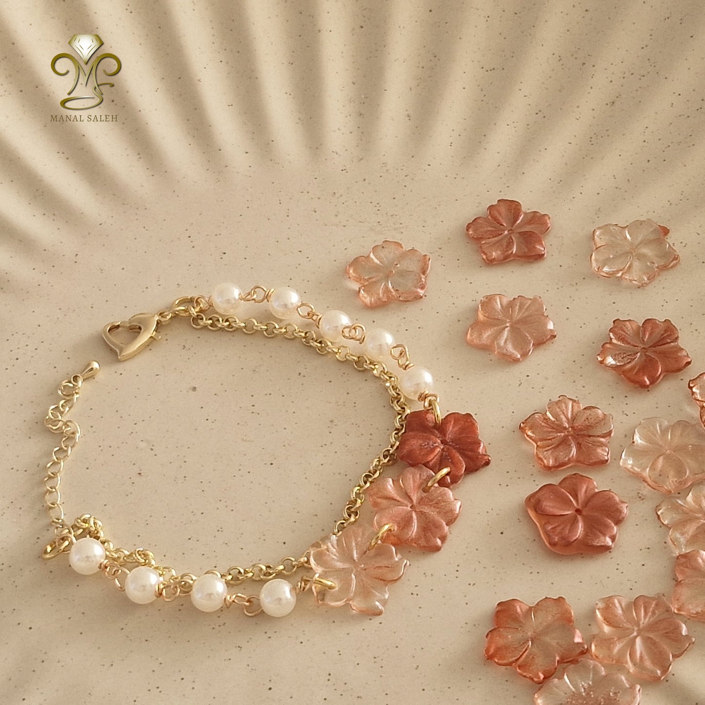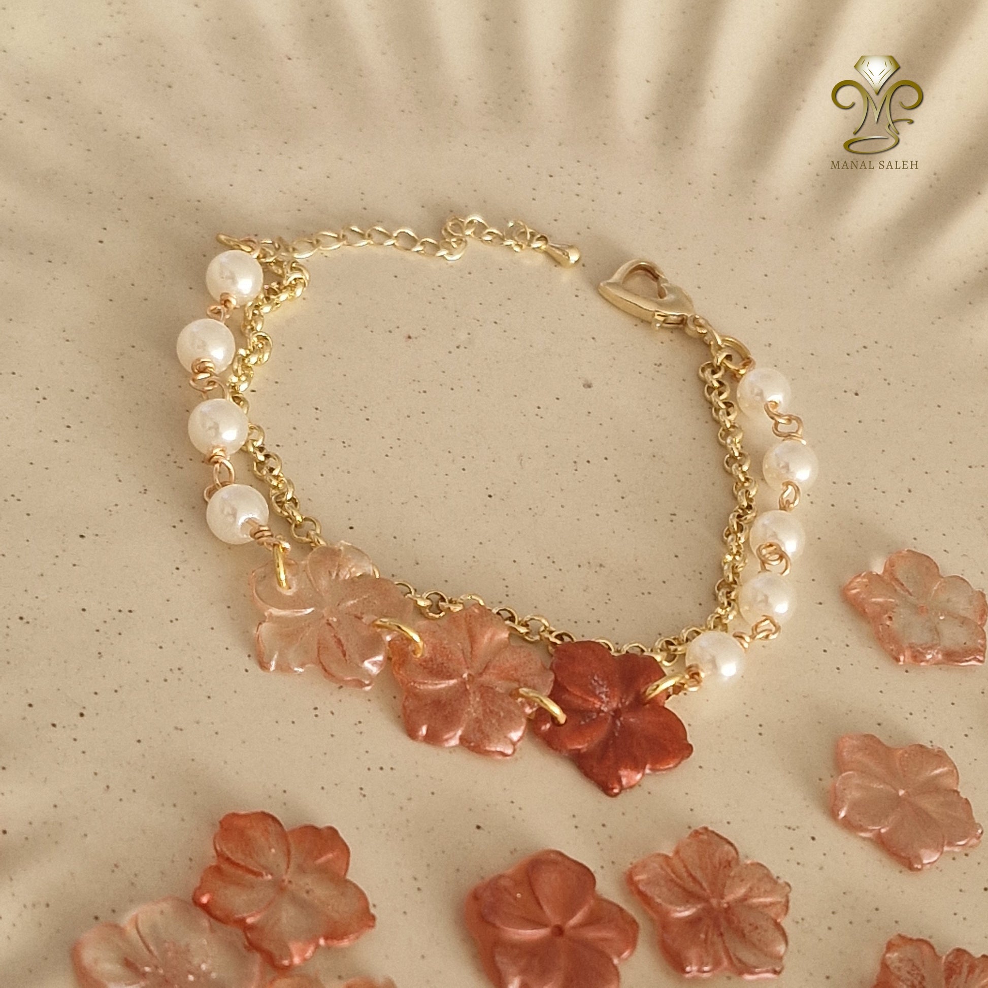 Experience the perfect combination of style and compassion with our handmade Hope pearls bracelet. Each pearl is wrapped with gold-plated wire, accented with beautiful rose roses made of resin. The classy double chain bracelet is completed with a heart-shaped clasp. Show your support for the Palestinian cause while looking classy!